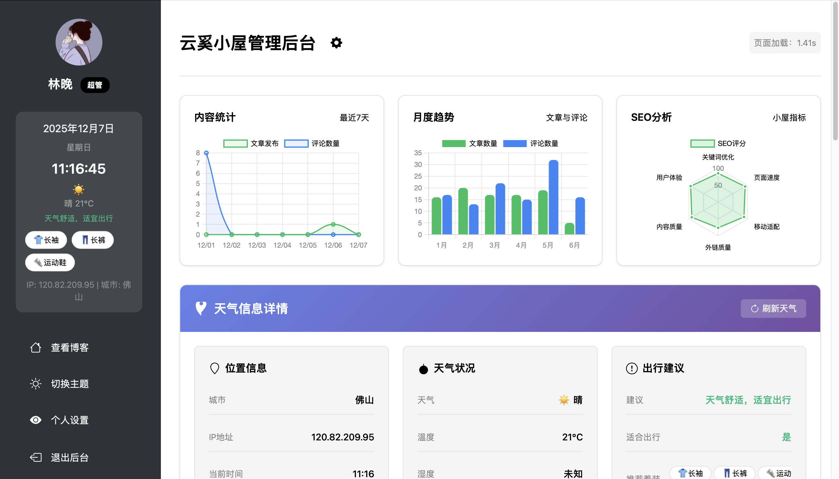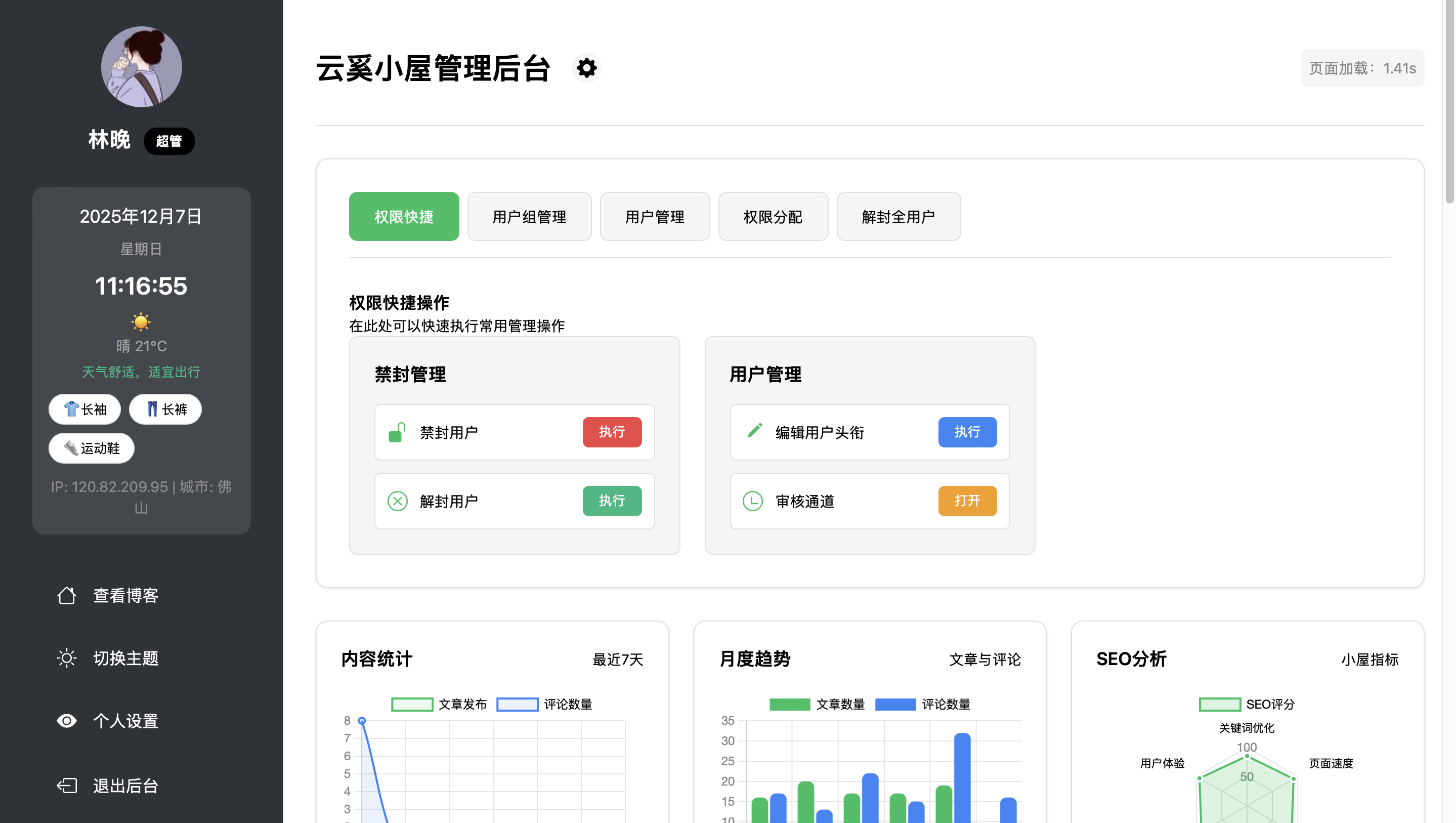目前后台可以独立给每一个编辑,贡献者,管理员独立权限,后台可以看见自己的IP,天气等等等等等