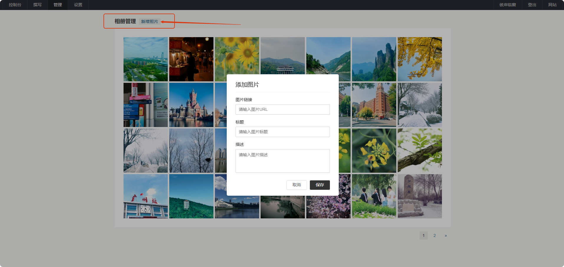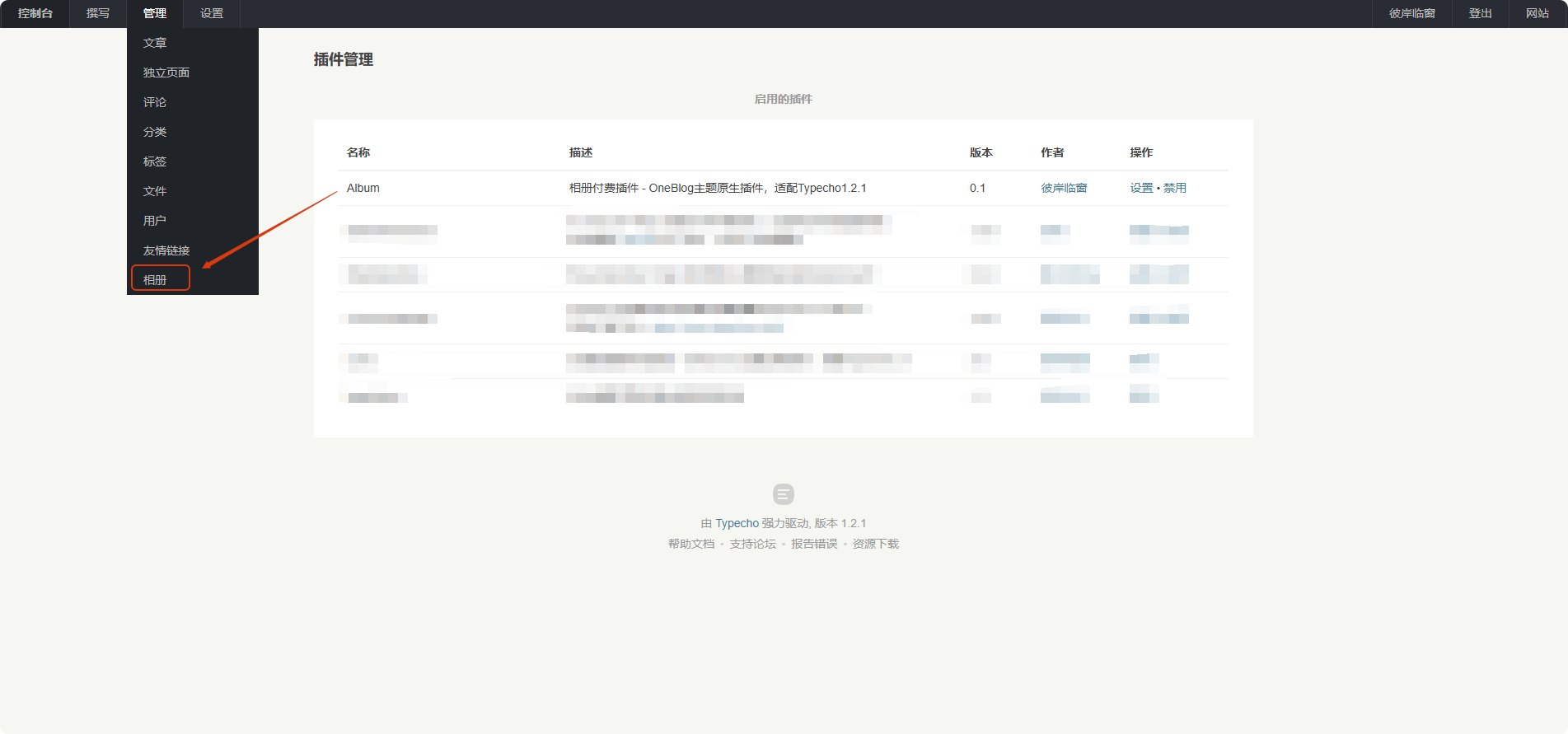 1.原生后台效果,在typecho内容管理页面增加了“相册”数据类型,点击即可进入相册数据的管理页面;